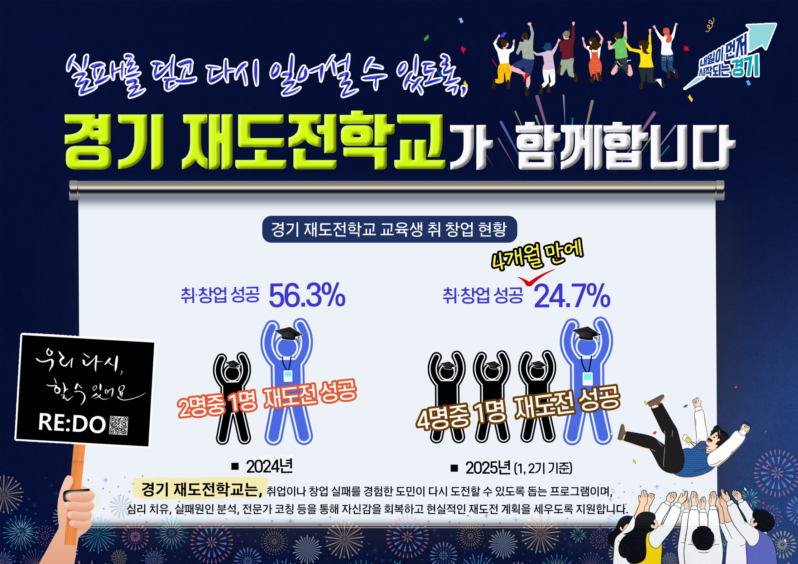 ‘경기 재도전학교’는 취업이나 창업 실패를 경험한 도민이 다시 도전할 수 있도록 돕는 프로그램이다. 심리 치유, 실패원인 분석, 전문가 코칭 등을 통해 자신감을 회복하고 현실적인 재도전 계획을 세우도록 지원한다.