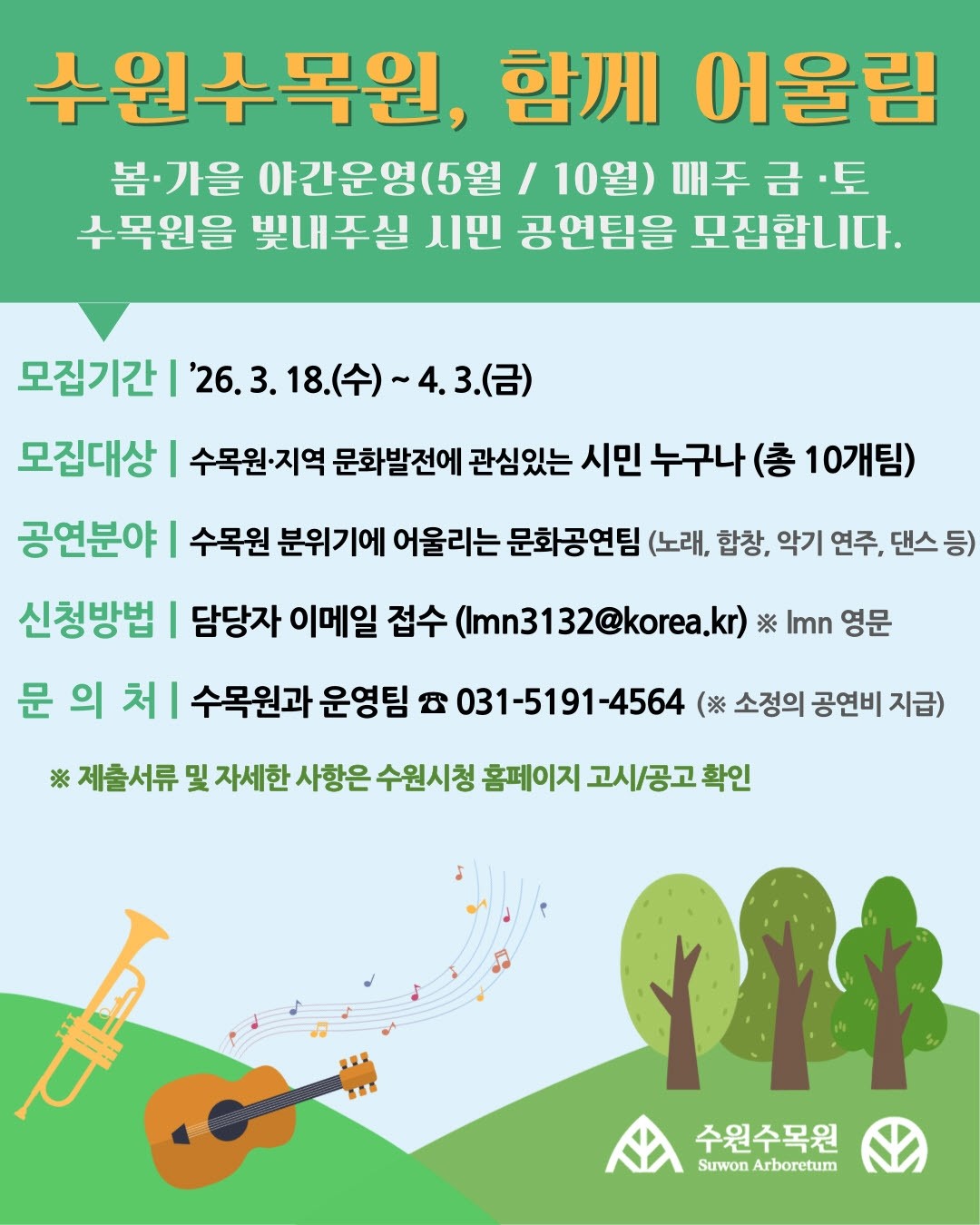 수원특례시(시장 이재준)가 수원수목원에서 열리는 시민 참여 문화공연 ‘수원수목원, 함께 어울림’에 참여할 시민 공연팀을 4월 3일까지 모집한다.